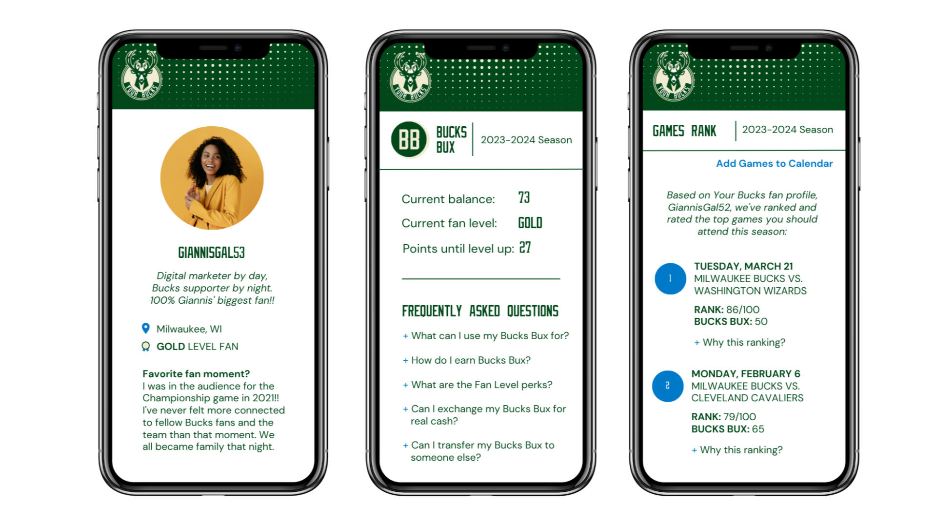 I participated in a technology bootcamp through the MKE Tech Hub Coalition, where interdisciplinary teams partnered with local organizations to design tech-forward solutions. I worked with the Milwaukee Bucks to explore how emerging technologies could deepen fan engagement.Together, my team designed Your Bucks, a mobile app concept featuring a fan loyalty program called Bucks Bux. The app leveraged machine learning to create personalized game-day recommendations, allowing fans to tailor their experience based on their interests, availability, and preferences.
