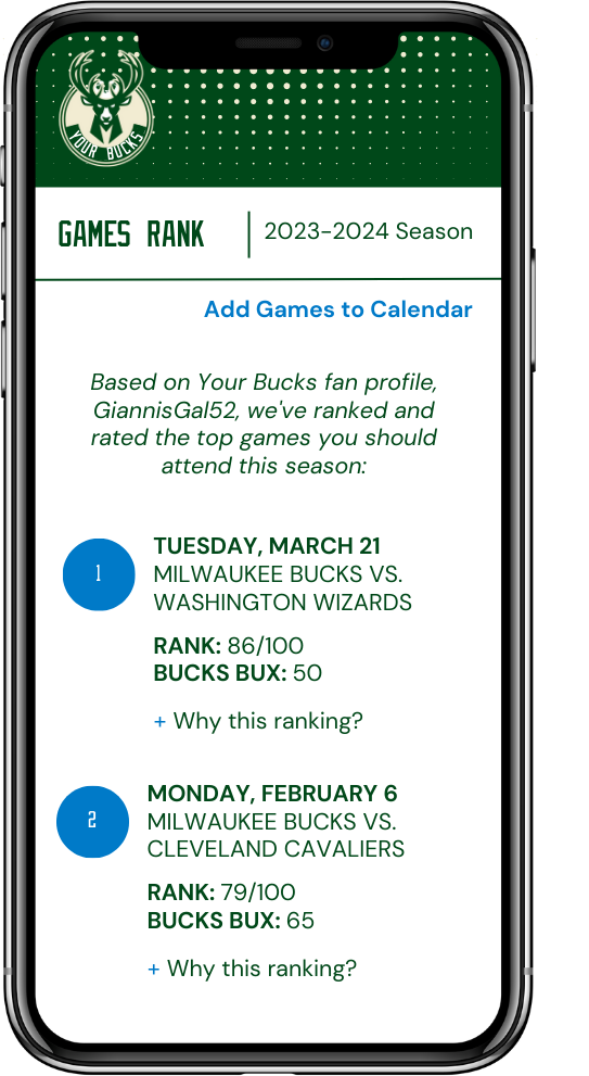 Throughout the 8-week program, I was able to meet and network with industry professionals, learn about data, AI, and tech ethics, and work on a team to create a solution to a problem proposed by a local organization. My team was paired with the Milwaukee Bucks and we developed an app called "Your Bucks" with a fan loyalty program called "Bucks Bux." We leveraged machine learning to create a fully customizable game day scheduler and personalized ranking system for folks to choose games that make sense for their wants and needs.